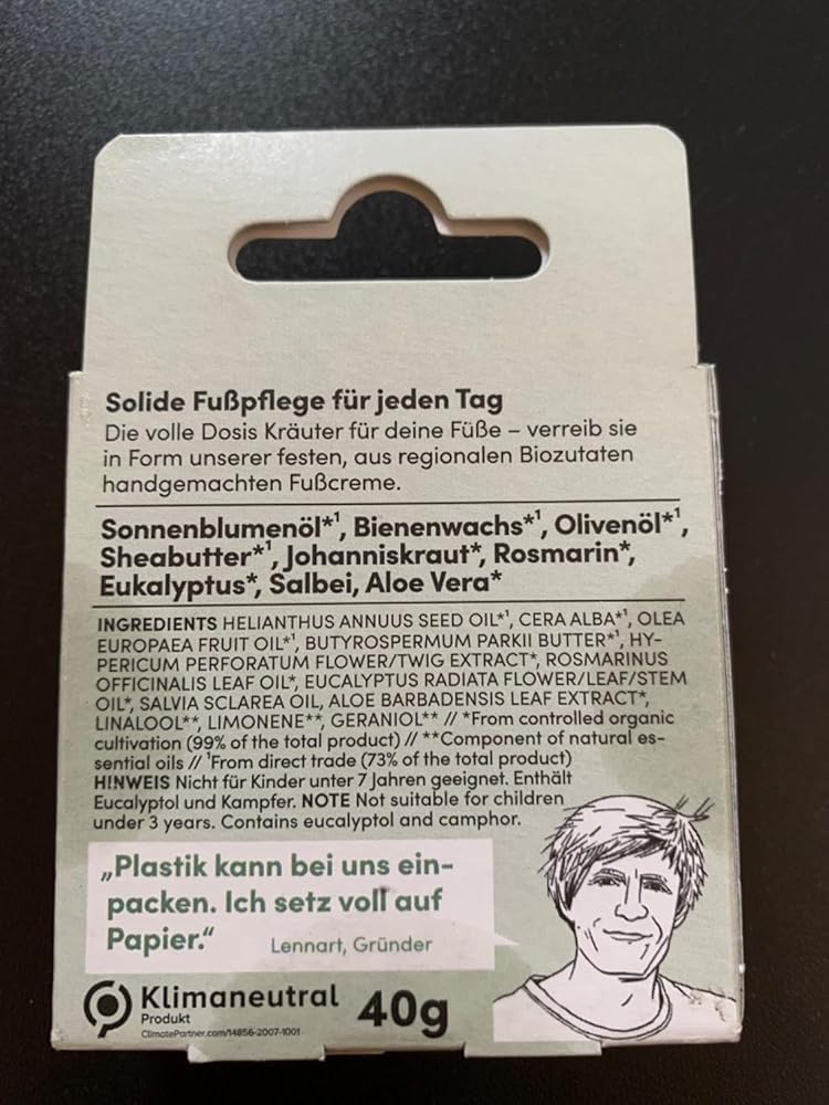 Diese feste Fußcreme (manche kennen sie noch unter dem Namen Zehenschmaus) pflegt die Haut der Füße intensiv und sorgt für spürbare Geschmeidigkeit. Die natürliche Formel mit Rosmarin fördert die Durchblutung, erfrischt müde Füße und belebt nachhaltig. Trockene und rissige Haut wird regeneriert und weich, während pflanzliche Inhaltsstoffe die Hautbarriere stärken und langanhaltende Feuchtigkeit spenden. Ideal für die tägliche Fußpflege, schützt sie vor Hautirritationen und sorgt für ein frisches, gepflegtes Gefühl. Perfekt für gesunde und rundum verwöhnte Füße – von Zeh bis Ferse.
